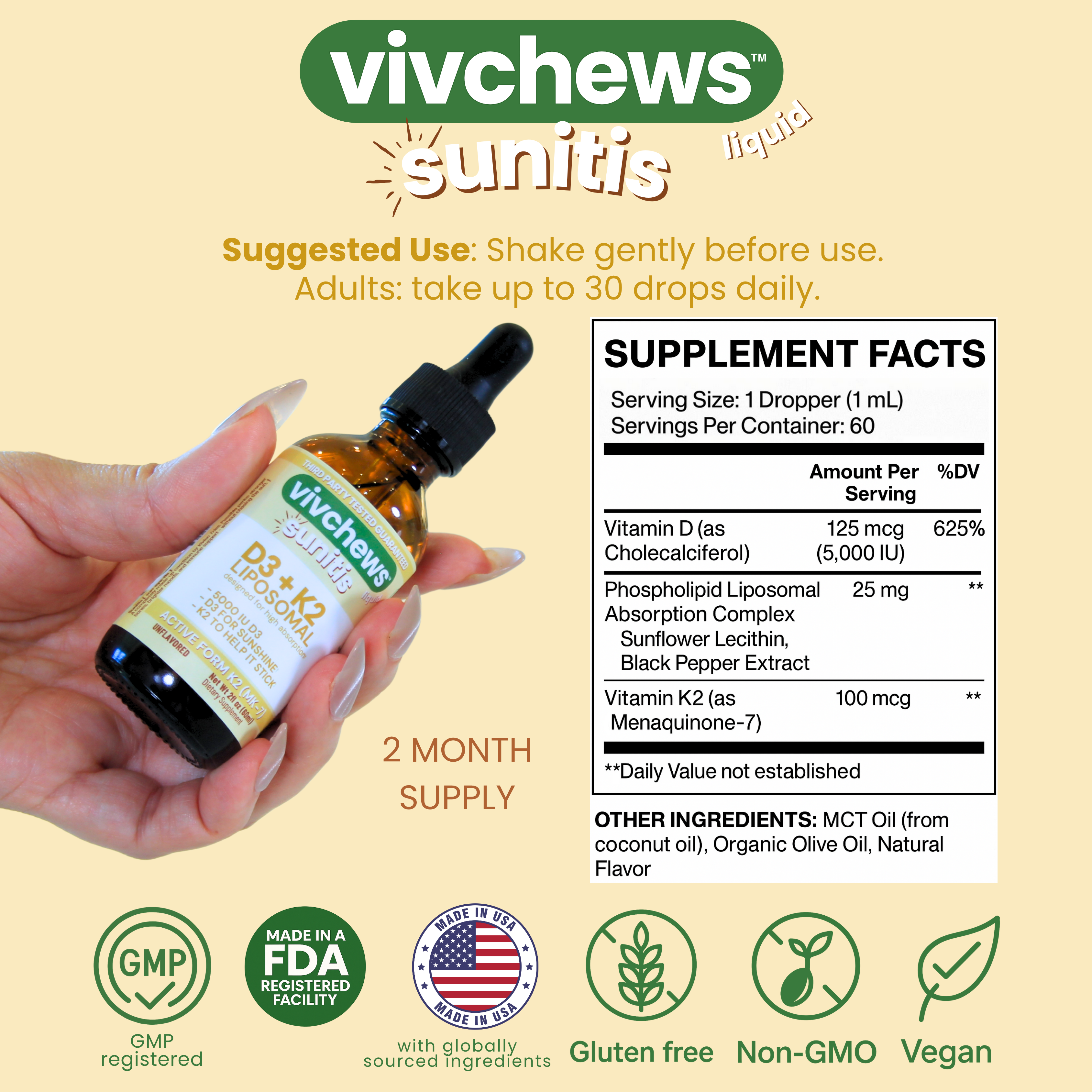 Meet Sunitis, your daily dose of sunshine in a bottle. This liquid blend delivers Vitamin D3 for mood, bone, and immune support and Vitamin K2 (MK-7) to help your body put D3 to work, where it belongs. Together, they support calcium balance, healthy bones, and overall vitality.