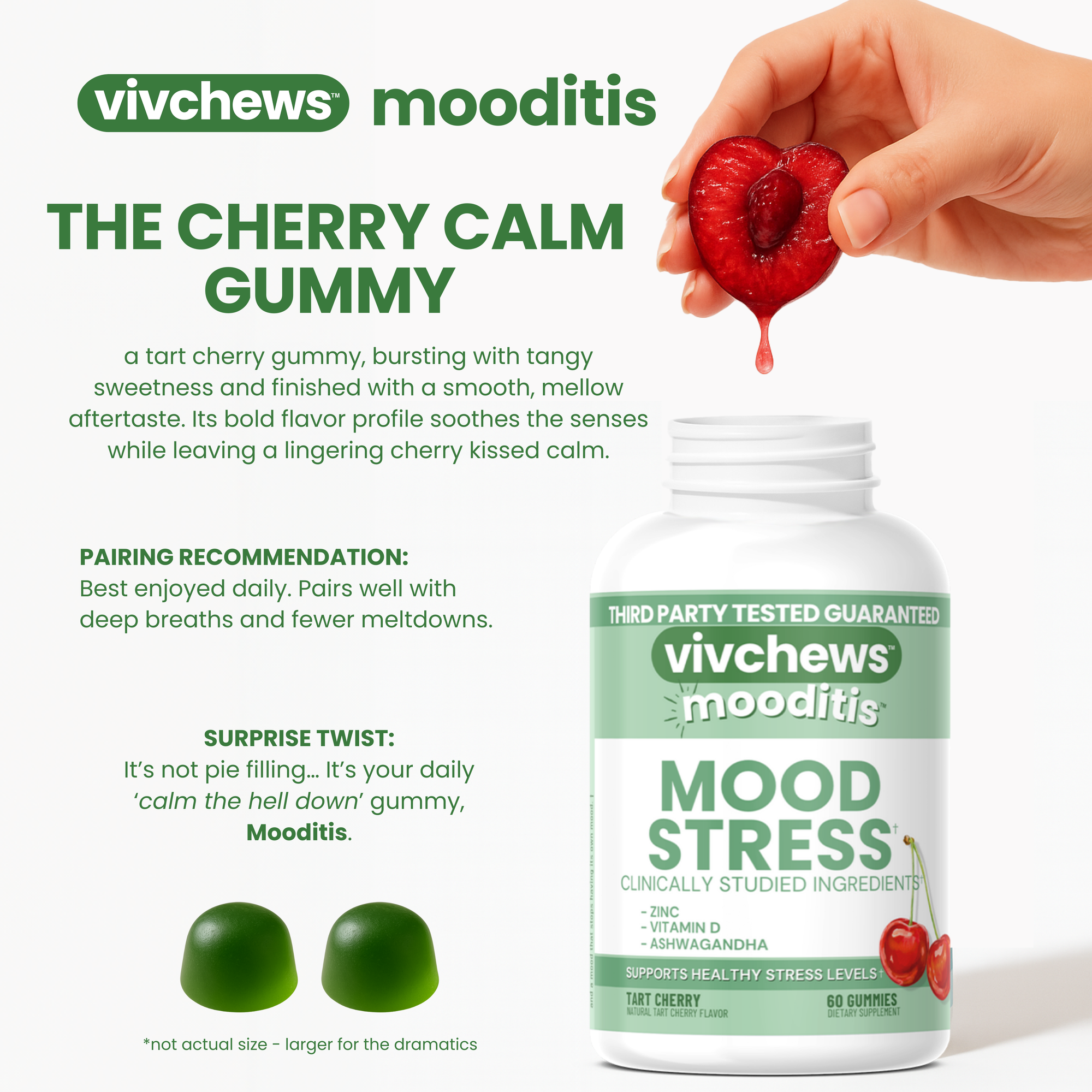 You were fine. Then your email tone got misread and now you're spiraling. Grab two mooditis™ mood & stress gummies and exit the group chat in peace. Vitamin D, zinc, ashwagandha, and tart cherry flavor tag in to help take the edge off. Less snapping at strangers. More keeping it together.*